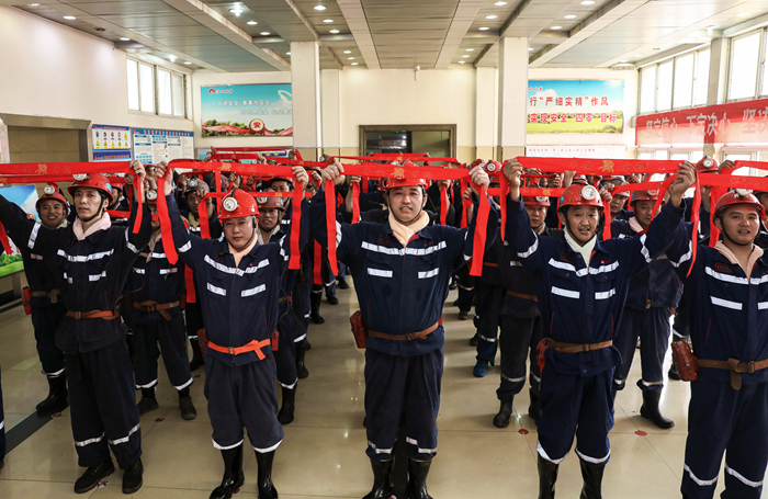 “安全生产月”中,桃园矿为每名矿工赠送了意寓着安全生产的红腰带,激发大家坚定安全“四零”目标。(陈敏奎 摄)