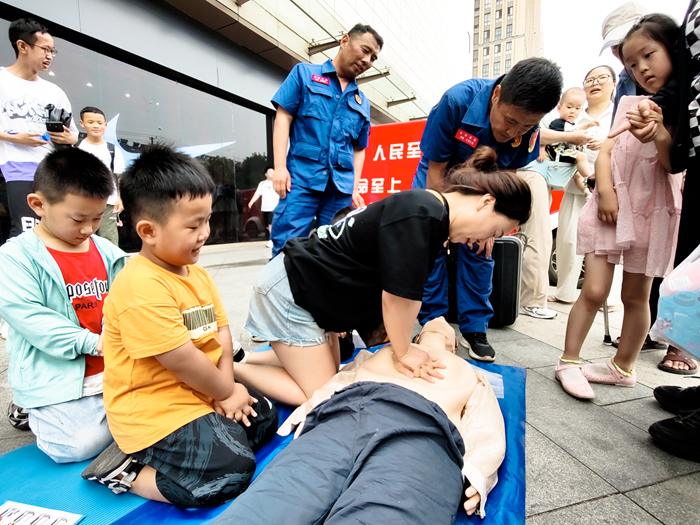 6月16日,救护大队志愿者走到街头,向市民讲解、传授急救知识,吸引众多市民驻足观看并参与。(吴加奇 摄)